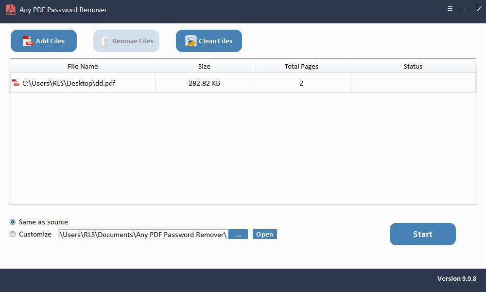 Advanced PDF Password Remover supports batch remove PDF Permissions/Owner Password. Click "Add Files" button to import PDF document files. You can select file and click "Remove Files" button to deleted unwanted PDF documents on the interface or click "Clean Files" to remove all imported PDF files.