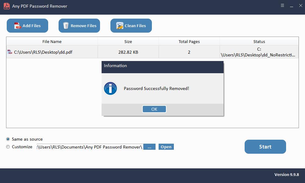 Select directory where you save the PDF file with no restriction. Click "Start" button to remove PDF Password within seconds.